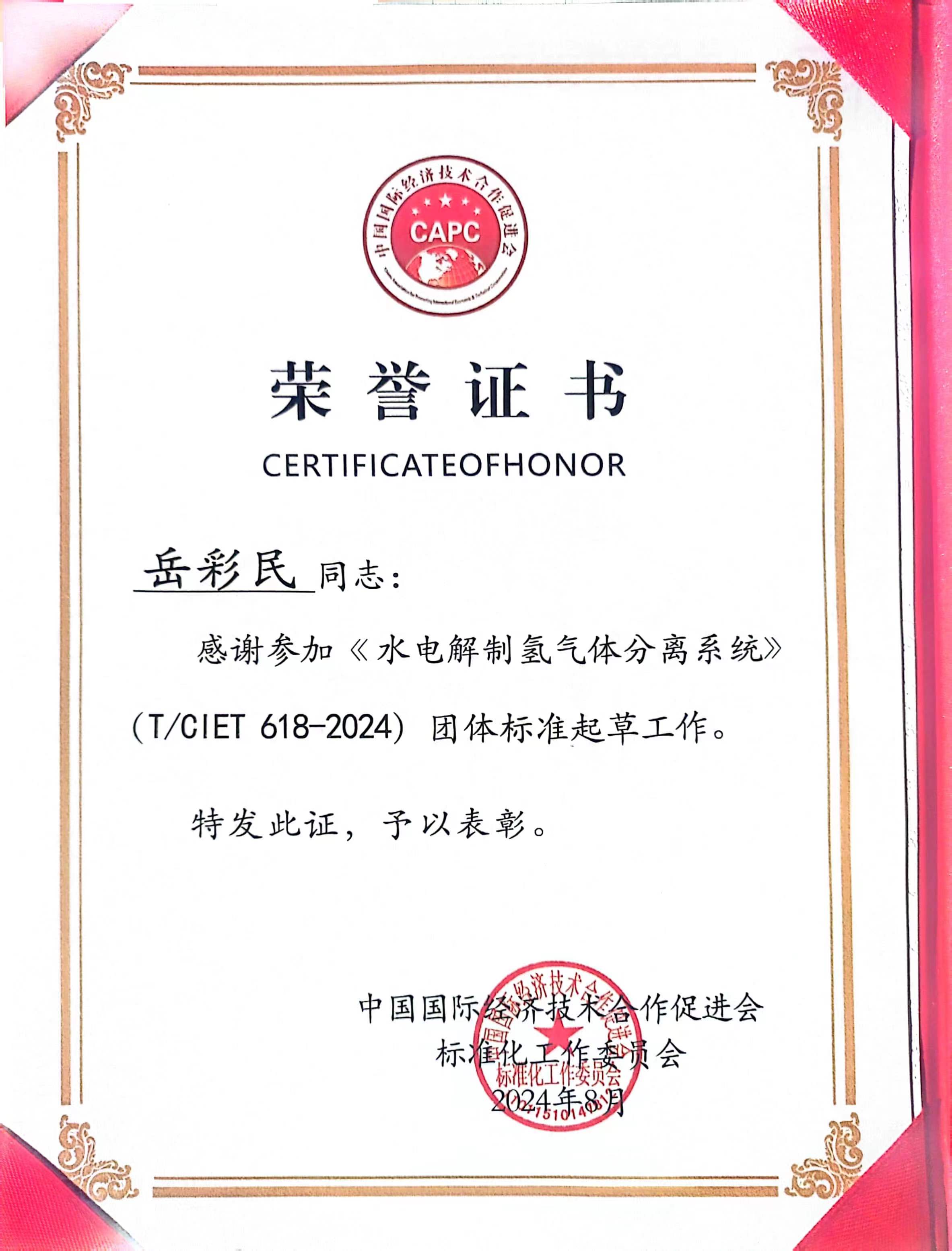 总经理岳彩民代表笃舜新能源参与起草(水电解制氢气体分离系统)团体标准